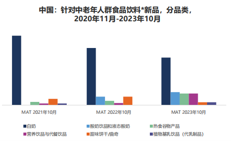 總體來說,中國的中老年食品跟全球市場相比的品類高度集中化的現(xiàn)象更為嚴(yán)重,主要集中在白奶(液奶和奶粉)。在過去三年內(nèi),中國的中老年食品飲料品類已經(jīng)開始朝多元化的方向發(fā)展。如酸奶、熱食谷物產(chǎn)品以及營養(yǎng)代餐飲品。在將來,品牌可以超更多的品類拓展,如全球市場的餅干、谷物棒等。