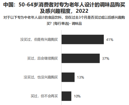 與其他品類相比,老年消費者對于醬料和調(diào)味品的沒興趣購買的比例最低,而“沒買過專為老年人設(shè)計的產(chǎn)品,但是有興趣購買”的比例最高,可以看出這一品類在中老年中有巨大的發(fā)展?jié)摿Α?/span>