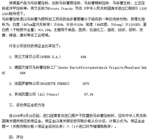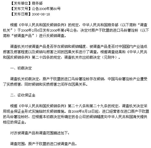 商務(wù)部公告2006年第60號(hào) 對(duì)原產(chǎn)于歐盟的進(jìn)口馬鈴薯淀粉反反傾銷案的初裁公告