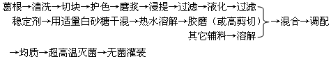 (1)清洗:在流水池中用刷子清洗葛根表皮上的泥土,并切去干縮,病蟲污染及霉爛變質(zhì)部分。 (2)磨漿:將葛切碎塊后,放入異Vc―Na護色液中。護色液重為葛重的1.8倍。打漿機打漿,靜置。調(diào)節(jié)護色液的pH值為6.0、靜置時間80分鐘,靜置溫度