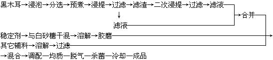 1.材料:黑木耳;白糖;蛋白糖;檸檬酸;β-環(huán)狀糊精;蜂蜜;穩(wěn)定劑:TKGO2。2.儀器與設(shè)備:組織搗碎機(jī)、恒溫水浴鍋、電子天平、均質(zhì)機(jī)、膠體磨、殺菌鍋3.工藝流程